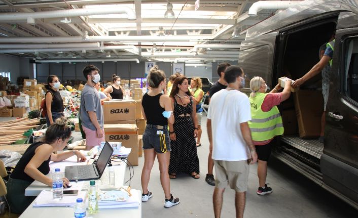 Muğla’nın Bodrum ilçesinde iki gün önce söndürülen yangında seferber olan vatandaşların gönderdiği yardım malzemeleri, Muğla’da 3 noktada devam eden yangınlar için gönderilmeye devam ediliyor.
