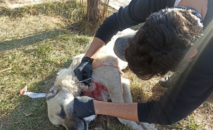 Boğazından yaralı halde bulunan köpek sokak ortasında ameliyat edildi
