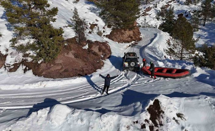 Artvin’in Yusufeli ilçesinde bir grup adrenalin tutkunu arkadaş, yıllarca Çoruh Nehri’nde kürek çektikleri botlarını bu kez bin 800 metre rakımda kar üzerinde ’Karrafting’ yaparak kullandılar.