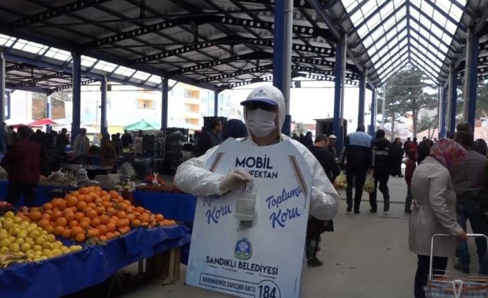 Türkiye’de ilk defa Afyonkarahisar’ın Sandıklı ilçesinde başlayan uygulama ile dezenfektan vatandaşların ayağına götürülüyor.