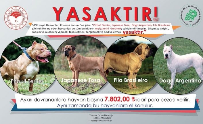 Tekirdağ Doğa Koruma ve Milli Parklar İl Şube Müdürlüğünce yapılan açıklamada, “Pitbull Terrier, Japanese Tosa, Dogo Argentino, Fila Brasileiro ve bu ırkların melezlerinin ülkemize girişi, üretilmesi, sahiplenilmesi, satışı, reklamının yapılması, takas edilmesi, sergilenmesi ve hediye edilmesi 5199 Sayılı Hayvanları Koruma Kanunu’nun 14. Maddesi (l) bendince yasaklanmıştır. Tekirdağ Doğa Koruma ve Milli Parklar İl Şube Müdürlüğümüzce de halkımızda farkındalık oluşturulması adına reklam panosu ile afiş çalışması yapılmış ve ilimiz genelinde halkımızın yoğun olarak kullandığı alanlarda yayımlanması sağlanmıştır” denildi.