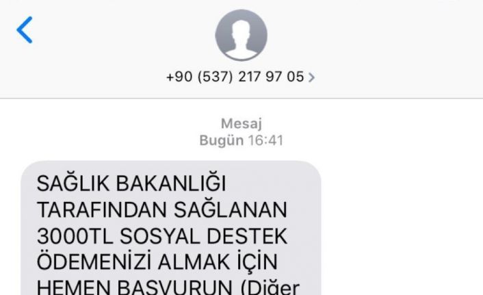 Dolandırıcılar, “Sağlık Bakanlığı tarafından sağlanan 3 bin lira sosyal destek ödemenizi almak için hemen tıklayınız, diğer sitelere itibar etmeyiniz” yazılı SMS gönderip link vererek, vatandaşları tuzaklarına düşürüyor