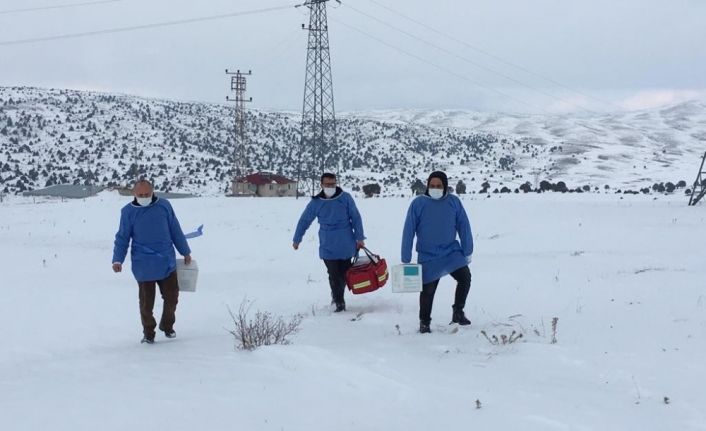 Kayseri’nin Sarız ilçesinde sağlık çalışanları, zorlu kış şartlarına rağmen bütün zorlukları aşarak yaşlıların aşılamasını yapıyor.