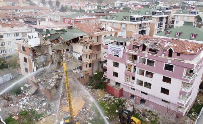 Büyükçekmece’de kentsel dönüşüm kapsamında hasarlı ve riskli yapıların yıkımında devam ediliyor. Atatürk Mahallesinde 3 bloktan oluşan 28 dairenin yıkım çalışmaları havadan görüntülendi.