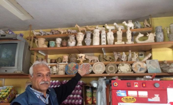 Osmaniye’nin Kadirli ilçesinde 32 yıldır mahalle bakkalı Yusuf Aslansofuoğlu, iş yerinde küçük bir tezgahta çakı ve çekiçle yaptığı yüzlerce taştan heykelciği bakkalında sergiliyor.