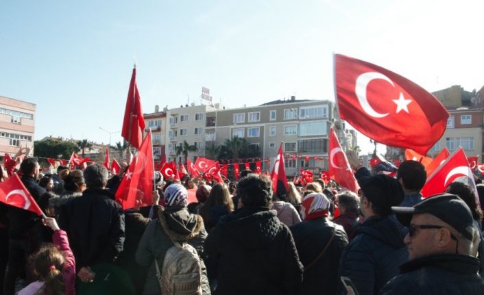 Ellerinde ay-yıldızlı bayraklarla Cumhuriyet Meydanı’nda bir araya gelen Çanakkaleliler, hem şehit düşen askerleri andı, hem de Mehmetçiğe destek sloganları attı. Saygı duruşunda bulunulması ve İstiklal Marşı’nın okunmasıyla başlayan programda İdlib’te şehit düşen askerler için dua edildi. Ardından açılan dev Türk bayrağının arkasında kortej oluşturan vatandaşlar, ’Şehitler ölmez vatan bölünmez’, ’Her Türk asker doğar’, ’Ne mutlu Türk’üm diyene’, ’Katil Esad hesap verecek’ sloganlarıyla yürüdü. Cumhuriyet Meydanında başlayan yürüyüş yeniden Cumhuriyet Meydanında son buldu.