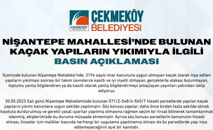 Çekmeköy Belediyesi’nin açıklamasında “İlçemizde bulunan Nişantepe Mahallesi’nde; 3194 sayılı imar kanununa uygun olmayan kaçak olarak inşa edilen yapıların yıkılması sonrası bir takım çevrelerce kasıtlı ve iyi niyetli olmayan, gerçeklerle alakası bulunmayan, toplumu yanlış bilgilendiren ya da kasıtlı olarak yanlış bilgilendirmeyi amaçlayan yayınları yakından takip ediyoruz.