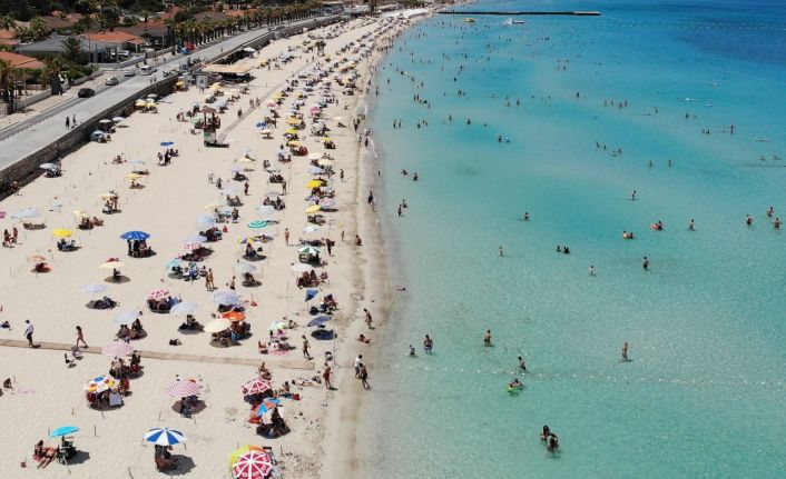 Kurban Bayramı sebebiyle ilan edilen 9 günlük tatili değerlendirmek isteyen vatandaşlar tatil beldelerine akın etti. Tatilini ilk günlerinden itibaren başlayan hareketlilik, Kurban Bayramı’nın ilk gününde de artarak devam etti. Türkiye’nin en ünlü tatil beldelerinden Çeşme’de de tatil yoğunluğu yaşanıyor. Birçok otelde doluluk oranlarının yüzde yüze ulaştığı ilçede dünyaca ünlü Ilıca Plajı da vatandaşların yoğunluk oluşturduğu plajların başında geliyor. Hissedilen sıcaklığın 40 dereceyi bulduğu Çeşme’de vatandaşlar serinlemek için denize girerken, bazı vatandaşlar da plajda güneşlenmeyi tercih etti. Yerleşik nüfusun 40 bin olduğu ilçede, yaşanan bayram yoğunluğu nedeniyle nüfus 1 milyonu buldu. Plajlarda yaşanan yoğunluk havadan görüntülendi.
