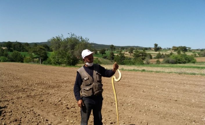 Denizli’de bir çiftçi, tütün tarlasında çalıştığı sırada traktörüne giren yaklaşık 1.5 metre boyundaki yılanı eliyle yakaladı. Yılanla adeta oyuncak gibi oynayan çiftçi, daha sonra hayvanı doğal yaşam alanına bıraktı.