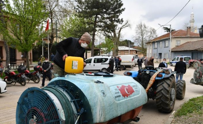 Osmangazi Belediyesi’nin koronavirüse karşı yaptığı dezenfekte çalışmalarına ilçedeki çiftçiler de traktörler ve ziraî ilaçlama makineleri ile destek verdi.