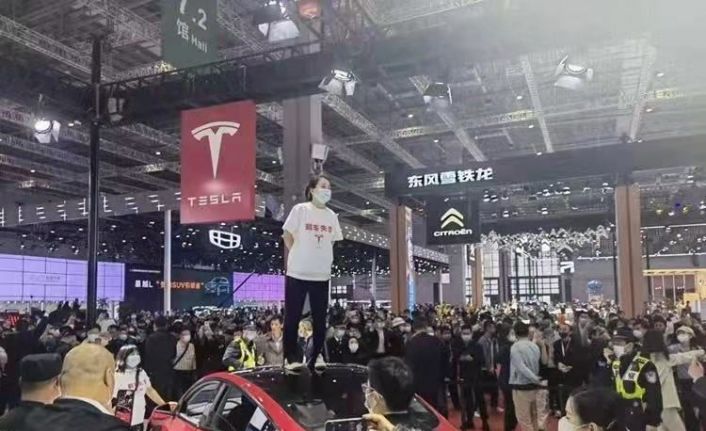 Çin’de bir kadın, otomobil fuarında sergilenen Tesla marka aracın üzerine çıkarak, "Tesla freni arızalı" diye bağırdı. Aracın üzerinden güçlükle indirilen ve sürüklenerek salondan çıkarılan kadın, kamu düzenini bozduğu gerekçesiyle 5 gün gözaltına alındı.