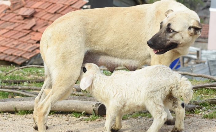 Sarı ismini verilen köpek, hem 7 yavrusunu hem de annesini emmeyen 15 günlük kuzuyu emzirerek annelik yapıyor. Annesinin sütünün az olması sebebiyle köpeği emen kuzunun artık iki annesi var.