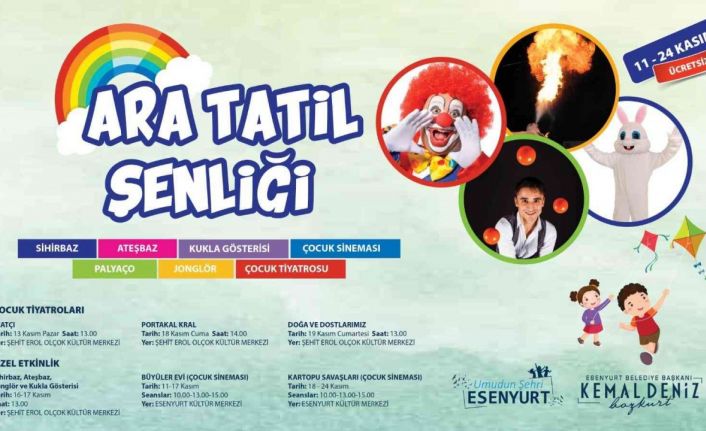 Esenyurt Belediyesi, öğrencilerin 9 günlük tatillerini eğlenceli bir şekilde geçirmeleri için bir dizi etkinlik hazırladı. Tiyatro, sinema ve ara tatil şenliği gibi her gün ayrı bir programın yer aldığı etkinlik takviminde, Esenyurtlu minikler hem eğlenecek hem de kültür sanat dolu bir hafta geçirecek. Belediyenin kültür merkezlerinde 11-24 Kasım 2022 tarihleri arasında gerçekleştirilecek olan etkinliklerde sihirbaz gösterileri, ateşbaz, jonglör, kukla gösterisi, palyaço, çocuk sineması ve çocuk tiyatrosu yer alıyor. Ara Tatil Şenliği ile eğlenceye doyacak olan çocuklar, yeni eğitim dönemine motivasyonla ve dinlenmiş bir şekilde başlayacak.