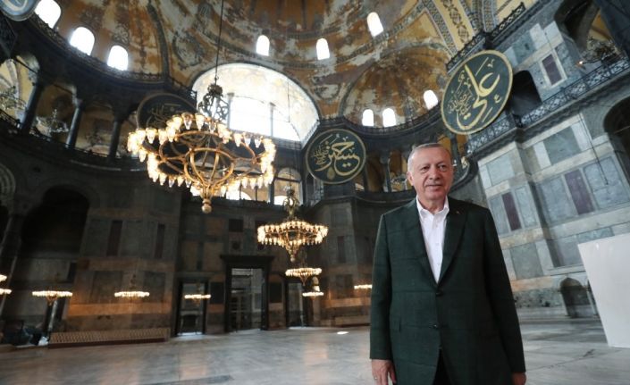24 Temmuz’da ibadete açılacak Ayasofya Camii’nde incelemelerde bulunan Cumhurbaşkanı Erdoğan, yapılan hazırlıklar hakkında Bakan Ersoy ve diğer yetkililerden bilgi aldı. Yaklaşık bir saat incelemelerde bulunan Cumhurbaşkanı Erdoğan, daha sonra buradan ayrıldı. Vatandaşların yoğun ilgi gösterdiği Cumhurbaşkanı Erdoğan, camiden ayrılmadan önce de bir süre İçişleri Bakanı Süleyman Soylu ile görüştü.