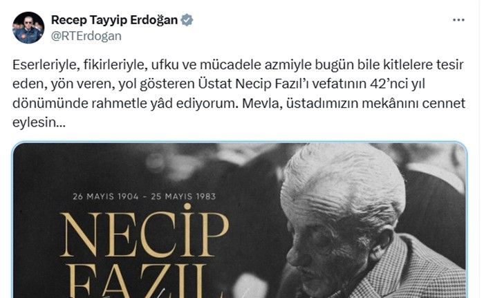 Cumhurbaşkanı Recep Tayyip Erdoğan, Necip Fazıl Kısakürek’in vefatının 42’nci yıl dönümü dolayısıyla sosyal medya hesabından bir mesaj yayımladı.