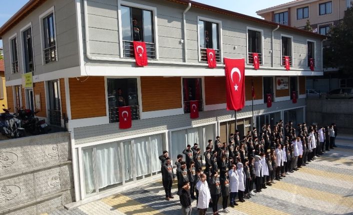 Marşın son kıt’asında cama çıkan öğrenciler asker selamı verirken, onlara okulun bahçesinde sırada bekleyen öğrenci ve öğretmenler de asker selamı vererek, eşlik ettiler.