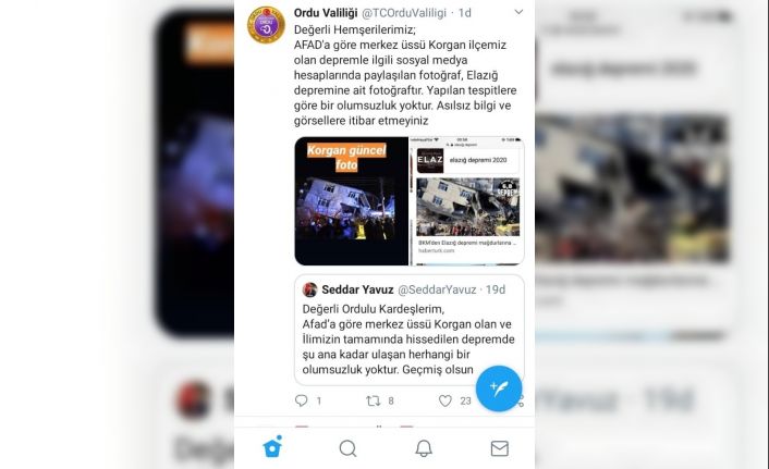 Öte yandan, Ordu Valiliği’nin sosyal medya hesaplarından yapılan paylaşımda, "Değerli hemşehrilermiz, AFAD’a göre merkez üssü Korgan ilçemiz olan depremle ilgili sosyal medya hesaplarında paylaşılan fotoğraf, Elazığ depremine ait fotoğraftır. Yapılan tespitlere göre bir olumsuzluk yoktur. Asılsız bilgi ve görsellere itibar etmeyiniz" ifadelerine yer verilirken, Ordu Büyükşehir Belediye Başkanı Dr. Mehmet Hilmi Güler ise sosyal medya hesaplarından, "Tüm hemşehrilerimize geçmiş olsun dileklerimi iletiyorum. Herhangi bir hasar söz konusu değil. Şu ana kadar bize ulaşan can veya mal kaybı, yaralanma bilgisi yok" ifadelerine yer verdi.