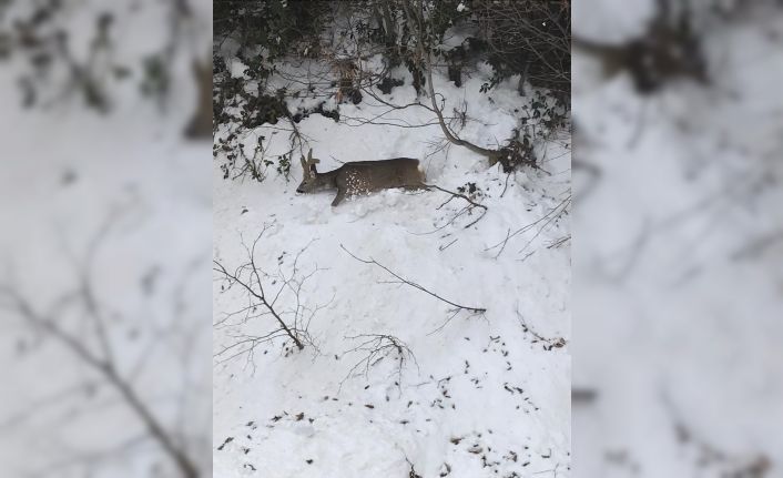 Kastamonu’da karla kaplı dereye düşen karacanın yardımına, kapanan yolları açmak için görevli olan treyler operatörü yetişti. Operatör, karacayı boynuzlarından tutarak saplandığı yerden çıkardı.