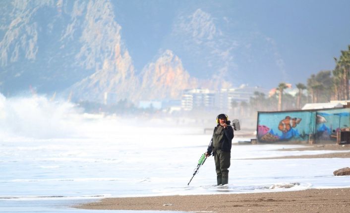 Antalya’nın dünyaca ünlü Konyaaltı Sahili’ne dedektörüyle gelen 1’i kadın 5 kişi, fırtınanın şiddetiyle büyüyen dalgaların kıyıya sürüklediğini düşündükleri altın ve değerli madenleri aradı.