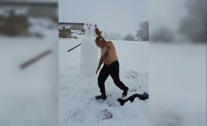 Sivas’ta bir vatandaş dondurucu soğuğa rağmen soyunup kardan adamla güreşerek karın tadını çıkardı.