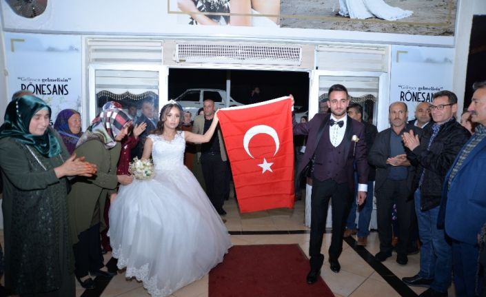 Gelin Duygu Yılmaz ise, “Düğünümüzde Türk bayrağı açalım dedim. Samet de o zaman saygı duruşunda bulunup İstiklal Marşımızı da okuyalım dedi. Çevremizden çok güzel tepkiler aldık. Gerekiyorsa bir ölüyorsak bin dirileceğiz ama yine de bayrağımızı dalgalandıracağız. Dualarımız askerlerimizle” diye konuştu.