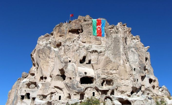 Türkiye’nin önemli turizm merkezlerinden Kapadokya bölgesinde bulunan dünyanın en yüksek peribacası konumundaki Uçhisar Kalesi’ne, Türkiye ile Azerbaycan’ın birlik ve beraberliğinin göstergesi olarak Azerbaycan bayrağı asıldı.