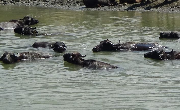 DÜZCE (İHA) – Son günlerde yaşanan bunaltıcı sıcaklar nedeni ile hayvancılık yapan vatandaşlar, mandalarını Düzce’de Küçük Melen Nehri’nde serinletiyor. Mandaları özellikle çamurlu alanlara getiren vatandaşlar, hayvanların sıcak havalarda çamuru daha çok sevdiğini belirtiyor.
