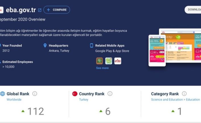 Salgın sürecinde ulusal ölçekte uzaktan eğitimin yürütüldüğü EBA, 2020-2021 eğitim öğretim yılı birinci dönem istatistiklerini geride bırakarak kullanım miktarı ve internet trafiği kriterlerine göre eğitim alanındaki tüm siteler arasında dünyada 1. sıraya yükseldi.