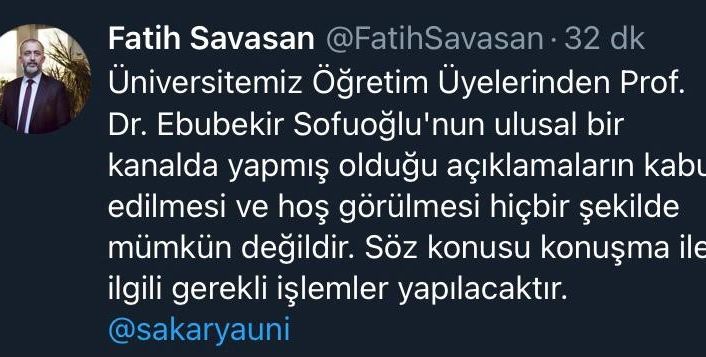 Sakarya Üniversitesi (SAÜ) Öğretim Üyelerinden Prof. Dr. Ebubekir Sofuoğlu’nun ulusal bir kanalda yapmış olduğu açıklamalara tepkiler çığ gibi büyüdü. SAÜ Rektörü Prof. Dr. Fatih Savaşan, açıklamaların kabul edilmesi ve hoş görülmesinin hiçbir şekilde mümkün olmadığını dile getirerek, söz konusu konuşma ile ilgili gerekli işlemlerin yapılacağını söyledi.
