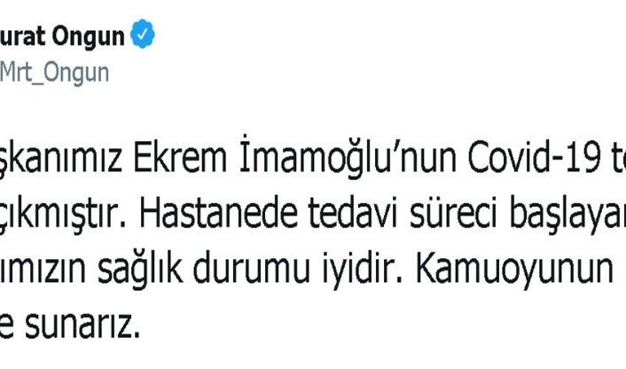 İstanbul Büyükşehir Belediyesi (İBB) Sözcüsü Murat Ongun, sosyal medya hesabından yaptığı açıklamada, “İBB Başkanımız Ekrem İmamoğlu’nun Covid-19 testi pozitif çıkmıştır. Hastanede tedavi süreci başlayan Başkanımızın sağlık durumu iyidir. Kamuoyunun bilgisine sunarız” ifadelerini kullandı.