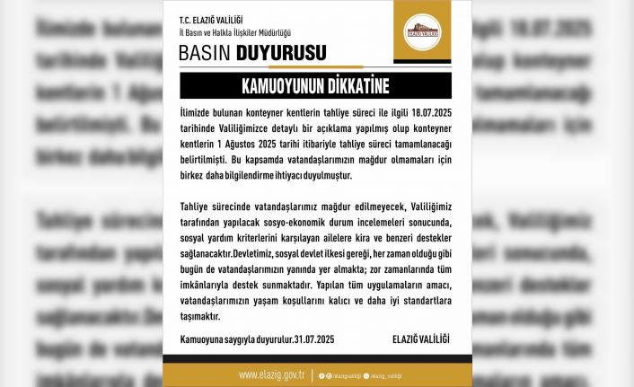Elazığ Valiliği’nden yapılan açıklamada, "İlimizde bulunan konteyner kentlerin tahliye süreci ile ilgili 18.07.2025 tarihinde Valiliğimizce detaylı bir açıklama yapılmış olup, konteyner kentlerin 1 Ağustos 2025 tarihi itibarıyla tahliye sürecinin tamamlanacağı belirtilmişti. Bu kapsamda vatandaşlarımızın mağdur olmamaları için bir kez daha bilgilendirme ihtiyacı duyulmuştur. Tahliye sürecinde vatandaşlarımız mağdur edilmeyecek, Valiliğimiz tarafından yapılacak sosyoekonomik durum incelemeleri sonucunda sosyal yardım kriterlerini karşılayan ailelere kira ve benzeri destekler sağlanacaktır. Devletimiz, sosyal devlet ilkesi gereği her zaman olduğu gibi bugün de vatandaşlarımızın yanında yer almakta; zor zamanlarında tüm imkânlarıyla destek sunmaktadır. Yapılan tüm uygulamaların amacı vatandaşlarımızın yaşam şartlarını kalıcı ve daha iyi standartlara taşımaktır" denildi.