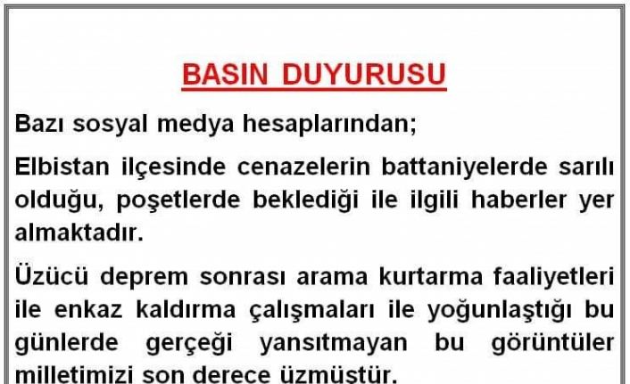 Elbistan Kaymakamlığı tarafından yapılan açıklamada, “Bazı sosyal medya hesaplarından; Elbistan ilçesinde cenazelerin battaniyelere sarılı olduğu, poşetlerle beklediği yönünde haberler yer almaktadır. Üzücü deprem sonrası arama kurtarma faaliyetleri ile enkaz kaldırma çalışmaları ile yoğunlaştığı bu günlerde gerçeği yansıtmayan bu görüntüler milletimizi son derece üzmüştür. İlçemizde defnedilmeyi bekleyen bir cenazemiz yoktur. Kamuoyuna saygıyla duyurulur” ifadelerine yer verildi.