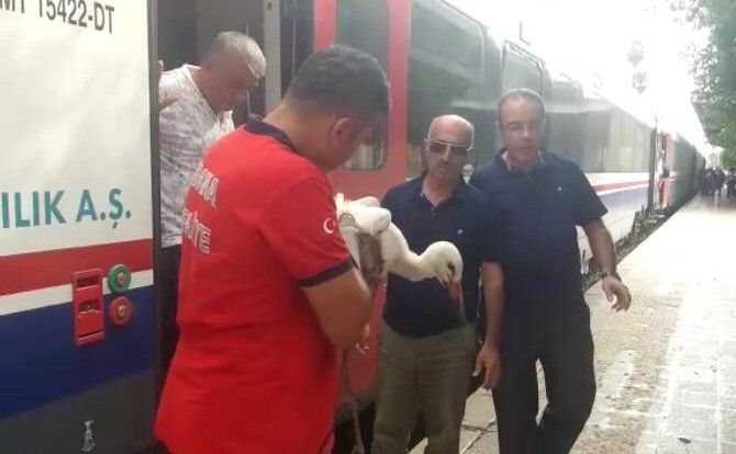 Hatay’ın İskenderun ilçesinden Adana’ya gelen trenin makinisti, rayların kenarında elektrik çarpması sonucu yaralanan leyleği görünce treni durdurup onu istasyonda itfaiye ekiplerine teslim etti.