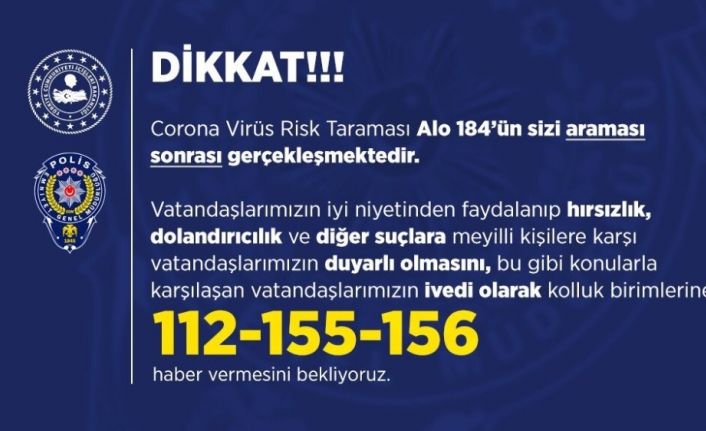 Emniyet Genel Müdürlüğü sosyal medya hesabından yapılan açıklamada, “Korona virüs risk taraması Alo 184’ün sizi araması sonrası gerçekleşmektedir. Vatandaşlarımızın iyi niyetinden faydalanıp hırsızlık, dolandırıcılık ve diğer suçlara meyilli kişilere karşı vatandaşlarımızın duyarlı olmasını, bu gibi konularla karşılaşan vatandaşlarımızın ivedi olarak kolluk birimlerine 112-155-155 haber vermesini bekliyoruz” denildi.