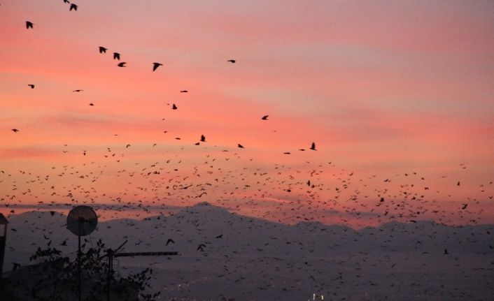 Erzurum’da akşam saatlerinde günbatımının oluşturduğu manzaraya kargalarında sürü halinde eşlik etmesi güzel görüntüler ortaya çıkarttı.