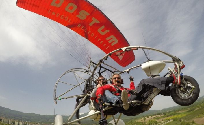 Paramotor pilotu İbrahim Dinçer, her gün ilçe semalarında uçarak paramotorun arkasına astığı pankartla sosyal mesaj veriyor. Paramotor ilçenin üzerinde her gün 1 saat uçuş yapıyor.