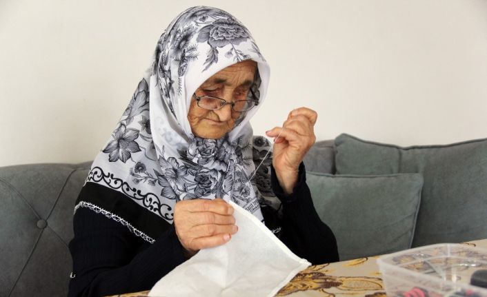 Hatay’da korona virüs yasağı kapsamında evinde kalan 75 yaşındaki bir kadın, zamanını maske dikip komşularına dağıtarak değerlendiriyor.