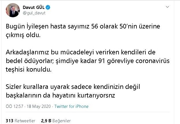 Gaziantep Valisi Davut Gül sosyal medyadan yaptığı açıklamada, 91 görevliye korona virüs teşhisi konulduğunu belirtti. Kentte 1 günde iyileşen hasta sayısının ise 56 olduğunu belirten Gül paylaşımında, "Bugün İyileşen hasta sayımız 56 olarak 50’nin üzerine çıkmış oldu. Arkadaşlarımız bu mücadeleyi verirken kendileri de bedel ödüyorlar; şimdiye kadar 91 görevliye coronavirüs teşhisi konuldu. Sizler kurallara uyarak sadece kendinizin değil başkalarının da hayatını kurtarıyorsunuz" ifadelerini kullandı.