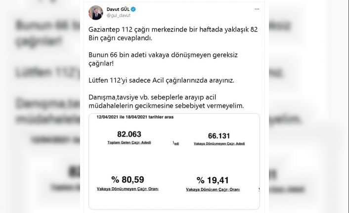 Gaziantep Valisi Davut Gül, 12-18 Nisan arasında 112 Acil Çağrı Merkezine yapılan 82 bin 63 çağrıdan 66 bin 131’nin gereksiz olduğunu söyleyerek, "Lütfen 112’yi sadece acil çağrılarınızda arayınız" uyarısında bulundu.