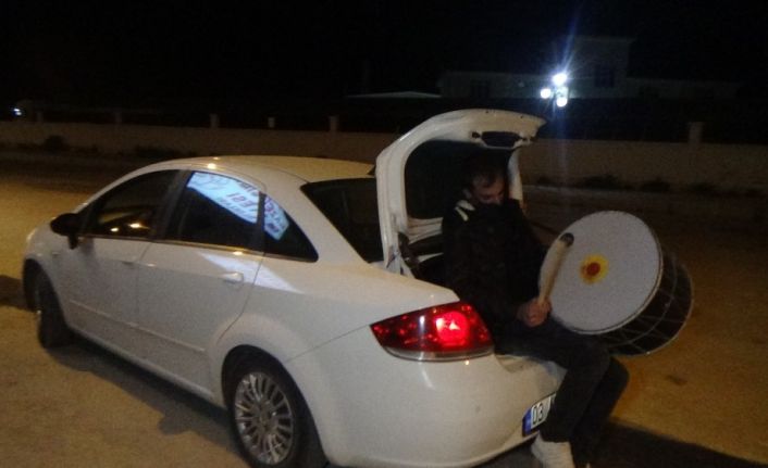 Ramazan davulcularının bahşiş toplamasına Covid-19 tedbirleri kapsamında müsaade edilmemesine rağmen Afyonkarahisar’da 3 genç, sosyal mesafeyi korumak için arabalarının bagajına binerek sahurda mahalle mahalle gezip asırlık geleneği yaşatmaya çalışıyor.