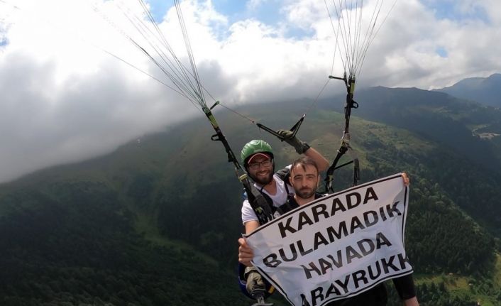 Trabzon’un Çaykara ilçesinin turizm merkezi Uzungöl’ün yüksek kesimlerinden yamaç paraşütü ile atlayan 34 yaşındaki Trabzonlu Muhittin Akbaş, evlenmek için görüştüğü kızların kendisinden ekonomik olarak çok zorladığını ve ev-araba gibi taleplerde bulunduğunu belirterek bu durumu bin 500 metre yükseklikte gökyüzünde açtığı “Karada bulamadık, havada arayruk” pankartı ile protesto etti.
