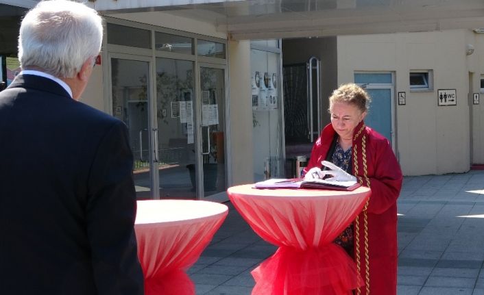 Çiftin nikahını kıyan memur Arife Ateş Demir, “Bu hafta sonu nikahımızdı, çiftler hafta içi acil nikah istediler. Çiftlerden biri yabancı. Bir ay önce İtalya’dan gelmiş. Bu yüzden tedbir almak için nikahı dışarıda kıymayı uygun gördük. Kapalı mekanlarda daha riskli, böyle daha iyi oldu daha güzel oldu” dedi.