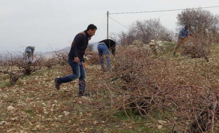 Daha iyi ve daha kaliteli bir verim alabilmek için bağ budamaya yaptığını belirten Çiftçilerden Yakup Çelik ise "Badem ağaçlarının çiçek açmasıyla budama işlemine başladık. Mümkün mertebe üzüm dalının biraz daha uzaması ve üzüm olduğu zaman yere değip bozulmaması için üzüm ağacın etrafındaki bozuk, çürük olan dalları kesip buduyoruz ve yeni çıkacak olan dallara bırakıyoruz" dedi.