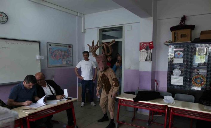 Türkiye’nin farklı illerinde çeşitli kostümlerle oy kullanmaya gidenler renkli görüntüler oluşturdu. Bursa’da da tiyatrocu Bahtiyar Keskin, giydiği geyik kostümüyle siyaset geyiğine son noktayı koydu. Boynuzlu başlığı ile okulun bahçesine girdiği andan itibaren vatandaşların ve çocukların ilgisini çeken geyik kostümlü Keskin, çocuklarla bol bol fotoğraf çekindi. Kostümünden ötürü, uzun süre kontrol için dışarıda beklemek zorunda kalan Keskin, daha sonra kafasındaki boynuzlu başlığı çıkarıp oyunu kullandı.
