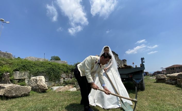 DÜZCE (İHA) – Düzce Belediyesi ve Kültür Bakanlığı tarafından kazı çalışmaları yürütülen Prusia ad Hypium Antik Kenti’nde güzel anlar yaşandı. Düzce Belediyesinde görevli olan ve düğünü olduğu için izin alan gelin Sinem Öztürk, giydiği gelinliği ile kazı çalışması yapan arkadaşlarını yalnız bırakmadı. Gelinlikle kazı alanına gelen Sinem Öztürk ve damat Yavuz Yiğit, günü anısı olarak hatıra fotoğrafı çektirmeyi de ihmal etmediler.