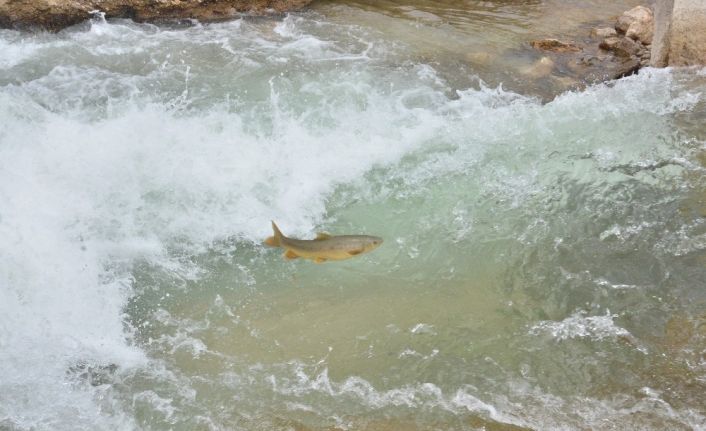 Kahramanmaraş’ın Elbistan ilçesinin en önemli akarsularından olan Söğütlü Çayı’nda, yumurtlamak için akıntıya karşı göç yolculuğuna çıkan balıklar, şelaleleri sıçrayarak aşıyor.