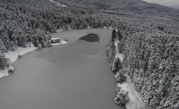 Yılın 4 mevsimi yurtiçi ve yurtdışından binlerce tatilcinin tercih ettiği Gölcük Tabiat Parkı’nın çevresinde bulunan çam ağaçlarının karla kaplı muhteşem manzarası havadan görüntülendi. Hava sıcaklığının sıfırın altında eksi 20 derecelere kadar düşmesi sonrası buz tutan gölün ormanla bütünleştiği görüntüler tatilcileri mest etti.