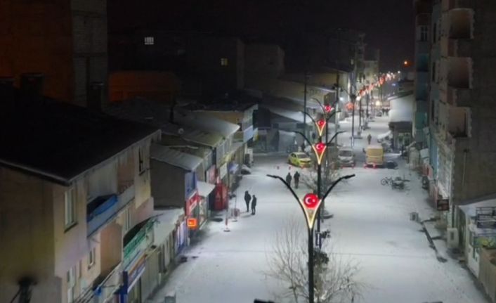 Ağrı’nın Diyadin ilçesinde akşam saatlerinde başlayan kar yağışı sonucu güne karla başlayan ilçe merkezi havadan görüntülendi.