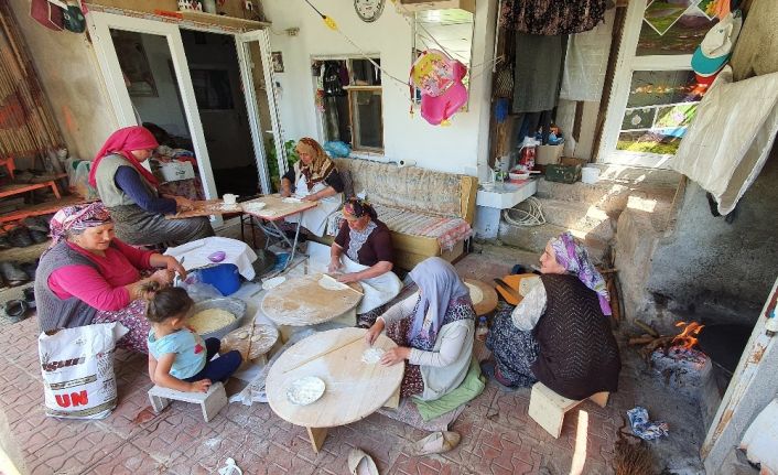 Mahalledeki birçok kadının bir araya gelerek yaptığı çalışmaların ardından birden fazla evin ihtiyacı hazırlanırken, külle sıvanmış saçta pişen yufkalar itinayla istiflenerek uygun şekilde depolanıyor.