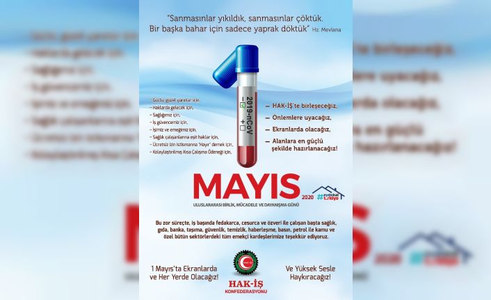 Türkiye’yi etkisi altına alan korona virüs salgını sebebiyle bu seneki 1 Mayıs’ı 27 Nisan-1 Mayıs tarihleri arasında “1 Mayıs Haftası” olarak kutlayacak olan HAK-İŞ Konfederasyonu, 30 Nisan tarihinde 81 ilde valiliklerce belirlenecek alanlarda temsili düzeyde katılımcıyla 1 Mayıs bildirisini okuyacak. Konfederasyondan konuya ilişkin yapılan açıklamada, “1 Mayısların birlik, mücadele ve dayanışma günleri olduğuna inanan HAK-İŞ Konfederasyonu olarak 1 Mayıs’ı tüm Türkiye’de taleplerimizi ilettiğimiz bir gün olarak kutlayacağız. Ülkemizi etkisi altına alan salgın sebebiyle bu seneki 1 Mayıs’ı 27 Nisan-1 Mayıs tarihleri arasında ’1 Mayıs Haftası’ olarak kutlayacağız. Konfederasyonumuz Yönetim Kurulu kararı ile örgütlü olduğumuz 81 ilimizde HAK-İŞ İl Başkanlıklarımız aracılığıyla valiliklerimize izin başvurusunda bulunduk. 1 Mayıs günü büyük şehirlerimizde tedbir amacıyla sokağa çıkma yasağının olmasını da dikkate alarak, 30 Nisan 2020 Perşembe günü saat 11.00’de bütün illerde valiliklerimizin belirleyeceği alanlarda HAK-İŞ 1 Mayıs bildirimizi okuyacağız. HAK-İŞ olarak tüm illerimizde belirli sayıda kişinin katılımı ile tüm tedbirlere ve sosyal mesafe kuralına uyarak illerimizin meydanlarında olacağız, taleplerimizi ve önerilerimizi dile getireceğiz. Daha fazla dayanışma, daha çok emek ve daha güçlü Türkiye için emekçilerimizin taleplerini, mesajlarımızı tüm platformlardan ileteceğiz. Bu zor günler bittiğinde binlerce emekçi kardeşimizle alanlarda en coşkulu şekilde buluşacağız” denildi.